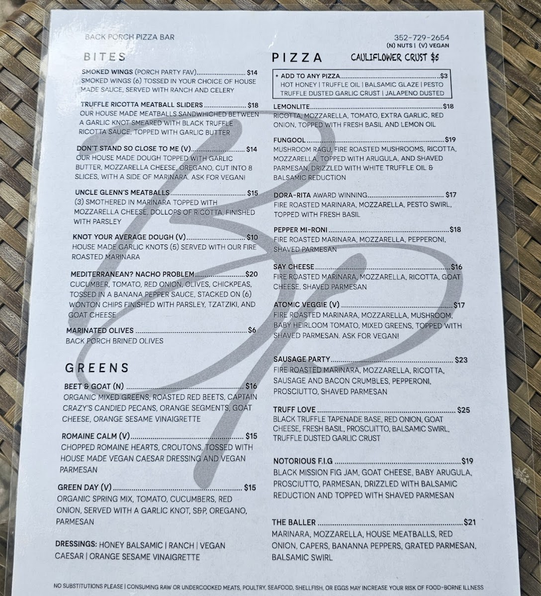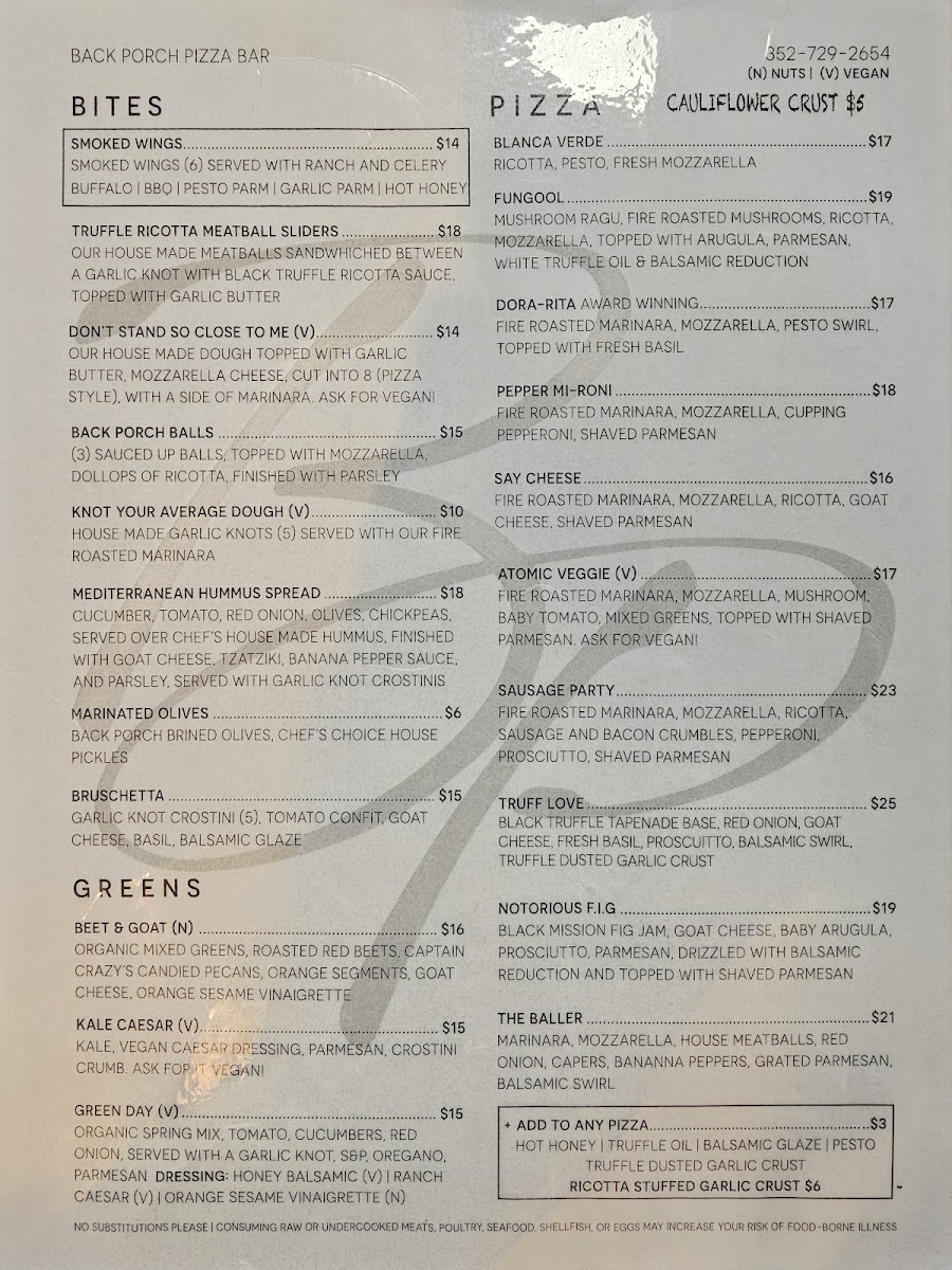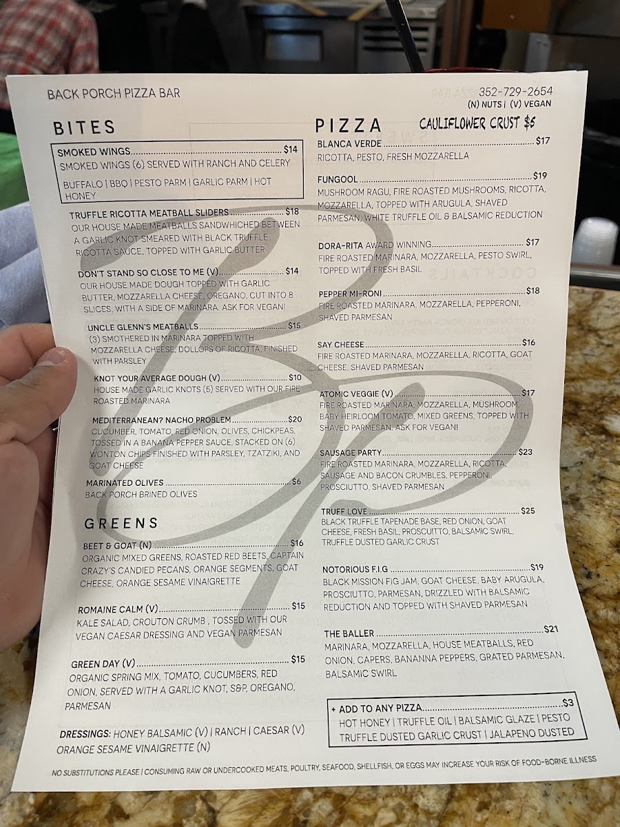 Back Porch Pizza Bar, located at 237 W 4th Ave Suite One, Mt Dora, FL, offers a diverse and flavorful menu that caters to a wide range of tastes, making it a must-visit spot for food enthusiasts. Starting with Bites, the restaurant offers an exciting array of appetizers, such as the Smoked Wings, perfect for those who enjoy a bit of smoky flavor with a crunchy bite. For something more indulgent, try the Truffle Ricotta Meatball Sliders or Uncle Glenn's Meatballs, which deliver a comforting, savory experience. Knot Your Average Dough is a unique take on bread, and Don't Stand So Close To Me provides a delicious, tangy twist to kickstart your meal.
