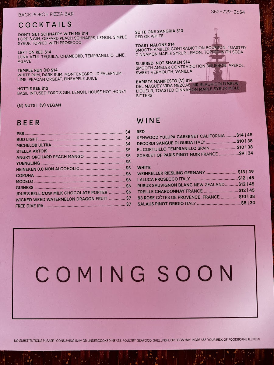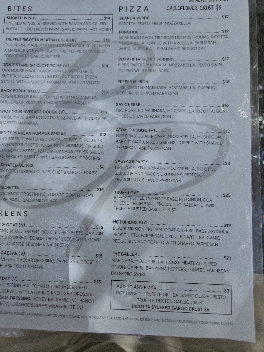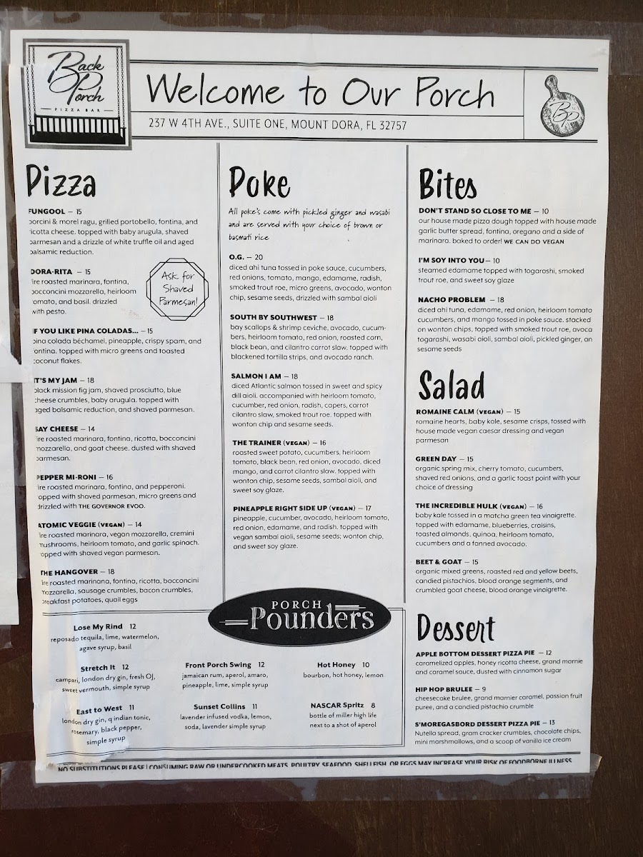 Back Porch Pizza Bar, located at 237 W 4th Ave Suite One, Mt Dora, FL, offers a diverse and flavorful menu that caters to a wide range of tastes, making it a must-visit spot for food enthusiasts. Starting with Bites, the restaurant offers an exciting array of appetizers, such as the Smoked Wings, perfect for those who enjoy a bit of smoky flavor with a crunchy bite. For something more indulgent, try the Truffle Ricotta Meatball Sliders or Uncle Glenn's Meatballs, which deliver a comforting, savory experience. Knot Your Average Dough is a unique take on bread, and Don't Stand So Close To Me provides a delicious, tangy twist to kickstart your meal.